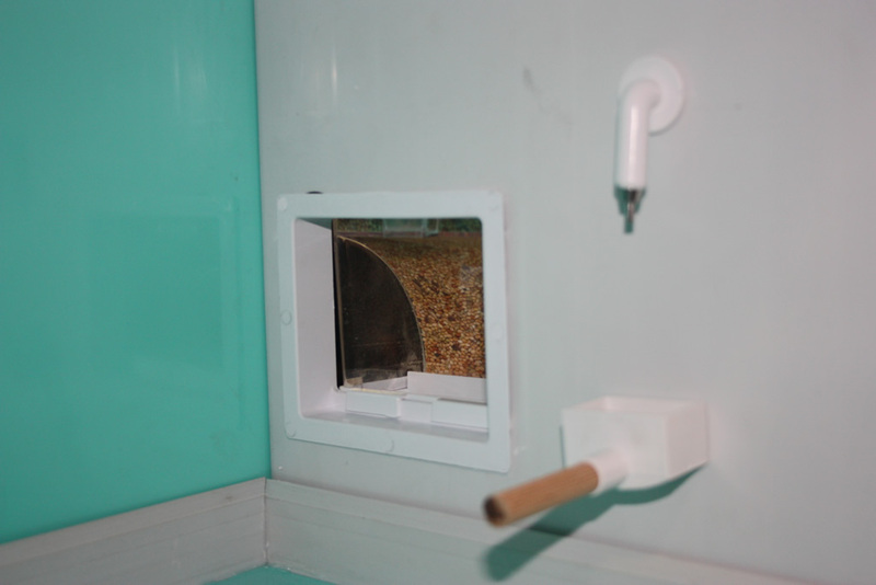 Kafes üzerine yerleştirilen 5 kg lık yem deposu tüm kafesleri yaklaşık 10 gün desteklemekte yenen yem kabuklarıda Dolap sisteminin en alt bölümüne konan plastik tavada toplanmakta, kafes içerisine kesinlikle dağılmamakta. Su deposu 5 lt dir.